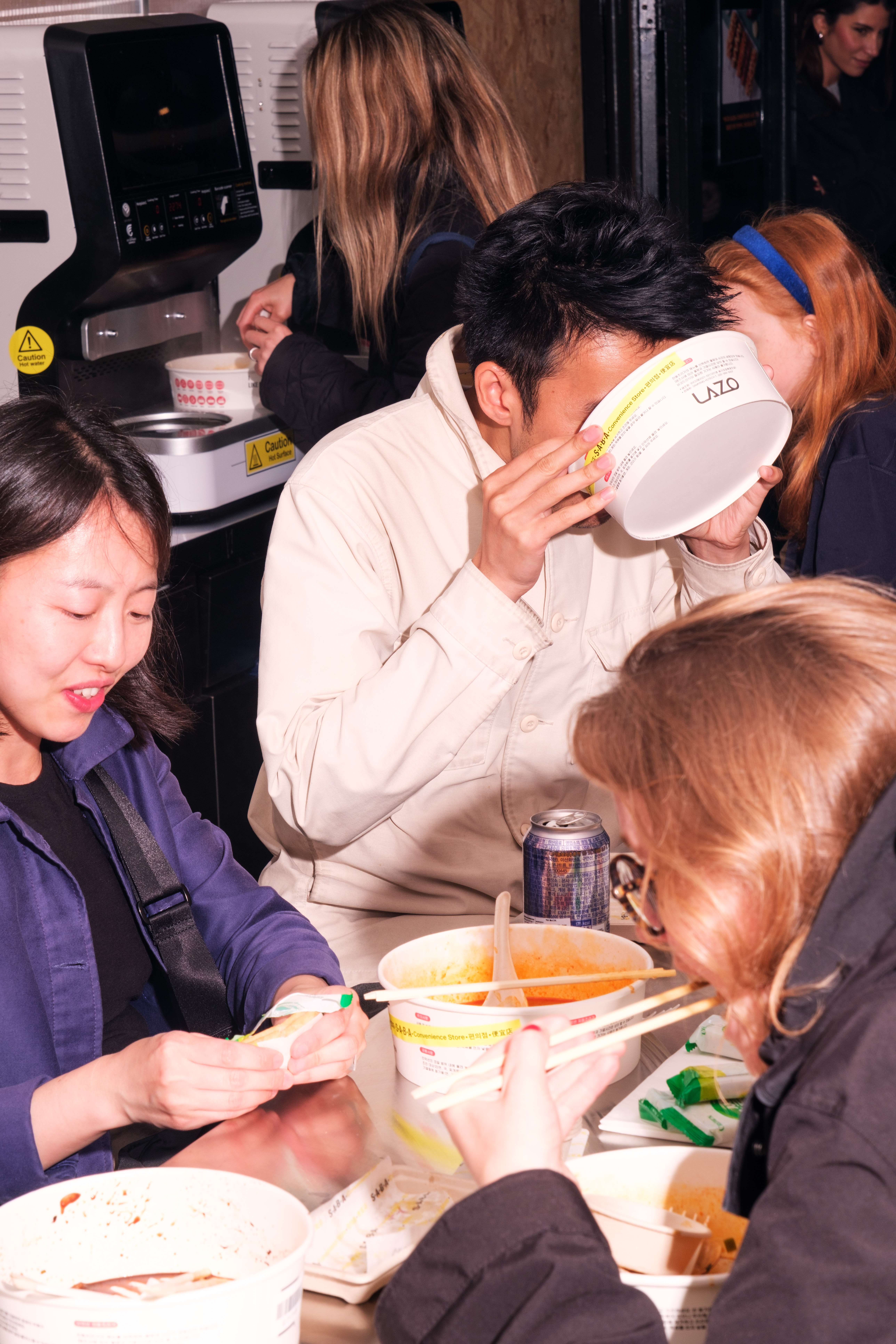 SABA Convenience Store is a place of action. It is an experience-oriented venue that simulates Korean city life on a London highstreet. SABA moves away from the typical expectations of a convenience store shopfront and instead locates a long steel dining table and various kitchen equipment for customers to use, such as ramen machines, microwaves and sinks, to its front display. SABA’s appearance from the street comprises carefully displayed instant products alongside our daily activities, encouraging acts of self-cooking and dining by all customers including children. It welcomes passer-by with curiosity. It ‘displays’ through the Korean way of city living and as a convenience store, plays between a shop, kitchen and a restaurant.